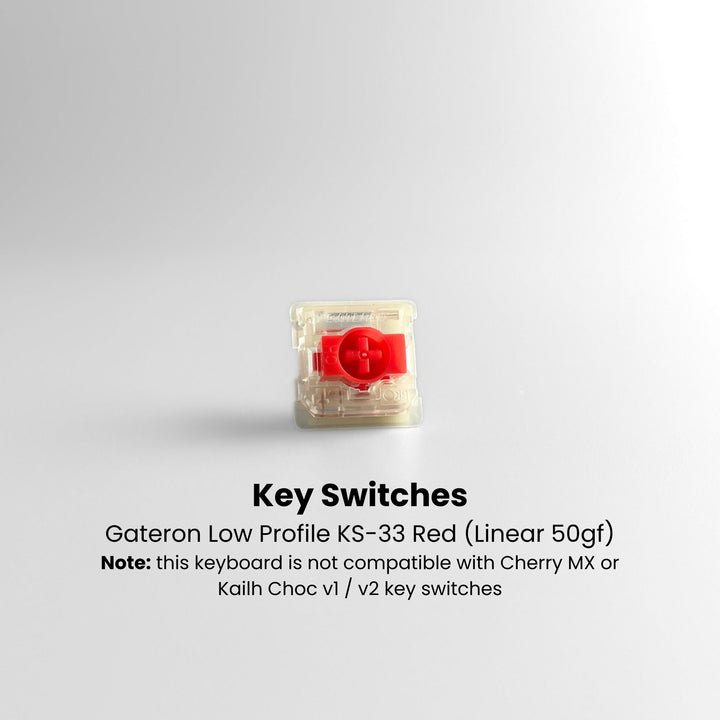 With Gateron low profile hotswap sockets: Compatible with Gateron low profile v1.0 (KS-27) and v2.0 (KS-33) key switches