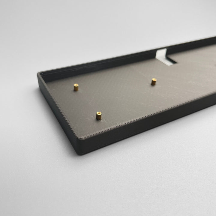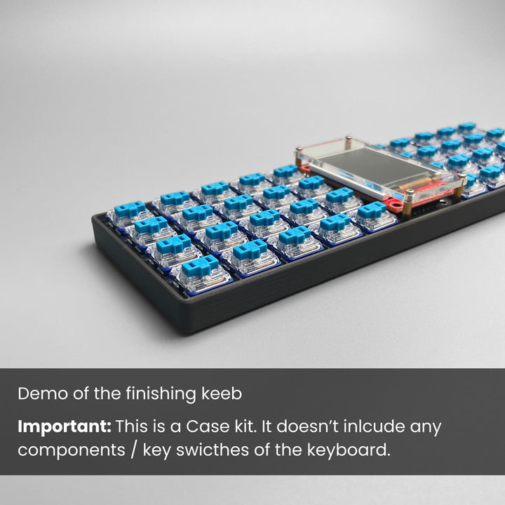 The keezyboost40 case kit includes 3D printed bottom case Acrylic cover for protecting the display Rubber feet Spacers Screws