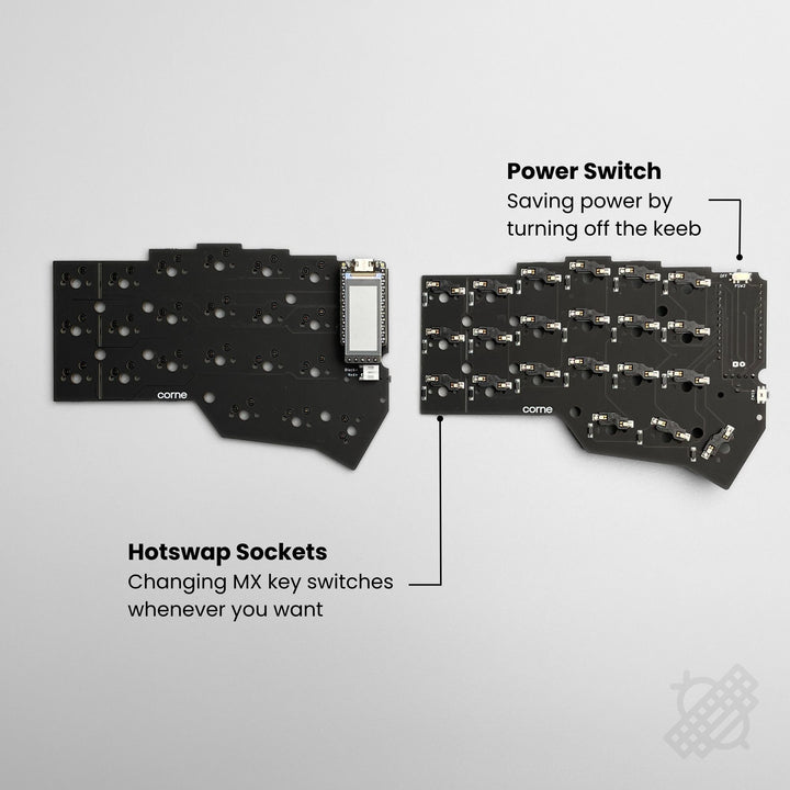 - Improved Battery Management: Power switches and JST battery sockets have been added to the Corne keeb. These additions make it easier to control power supply and facilitate seamless battery replacement.