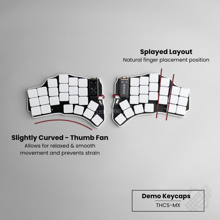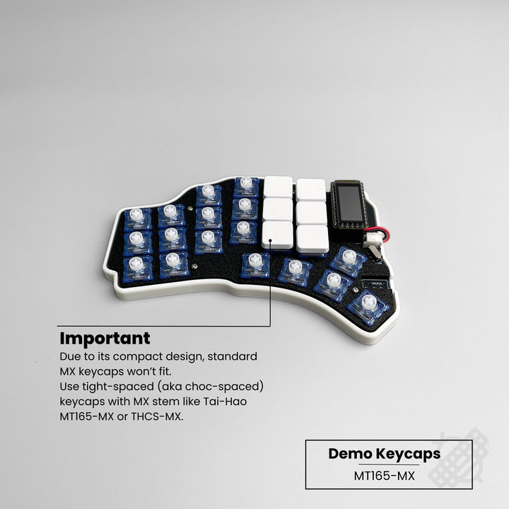 - Due to its compact design, standard MX keycaps is not compatible with this keyboard. Use tight-spaced (aka choc-spaced) keycaps with MX stem like Tai-Hao MT165-MX or THCS-MX.