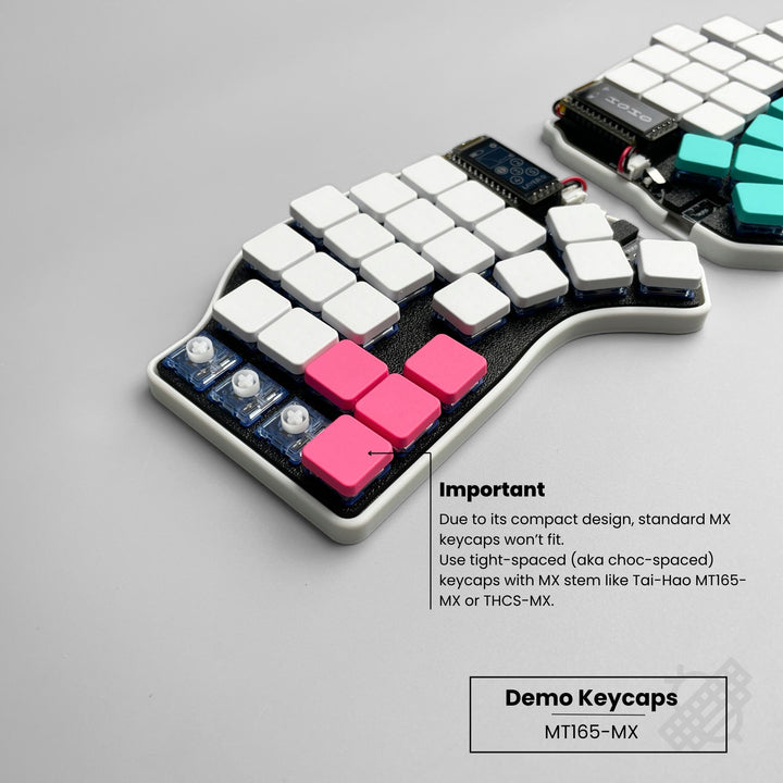 - Due to its compact design, standard MX keycaps is not compatible with this keyboard. Use tight-spaced (aka choc-spaced) keycaps with MX stem like Tai-Hao MT165-MX or THCS-MX.