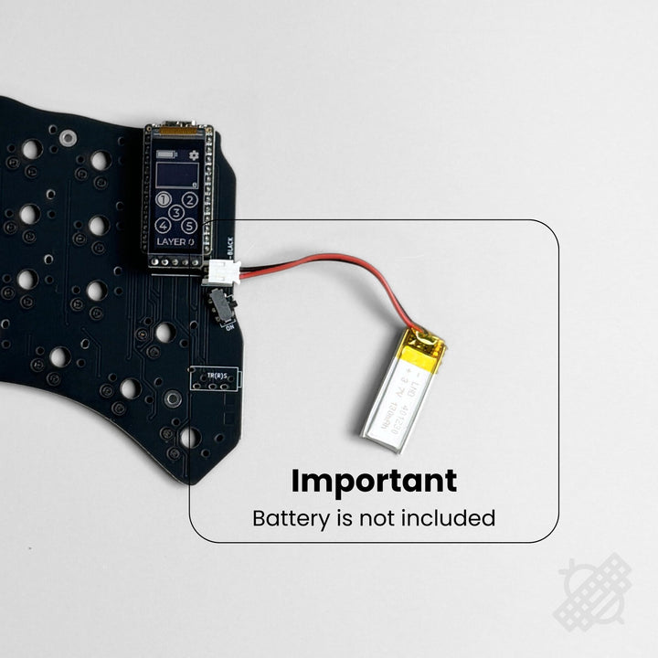 - Battery Requirement: This keyboard does not ship with batteries. Please purchase a pair of 301230 or 401230 batteries with JST-PH connectors and the correct polarity from local stores.