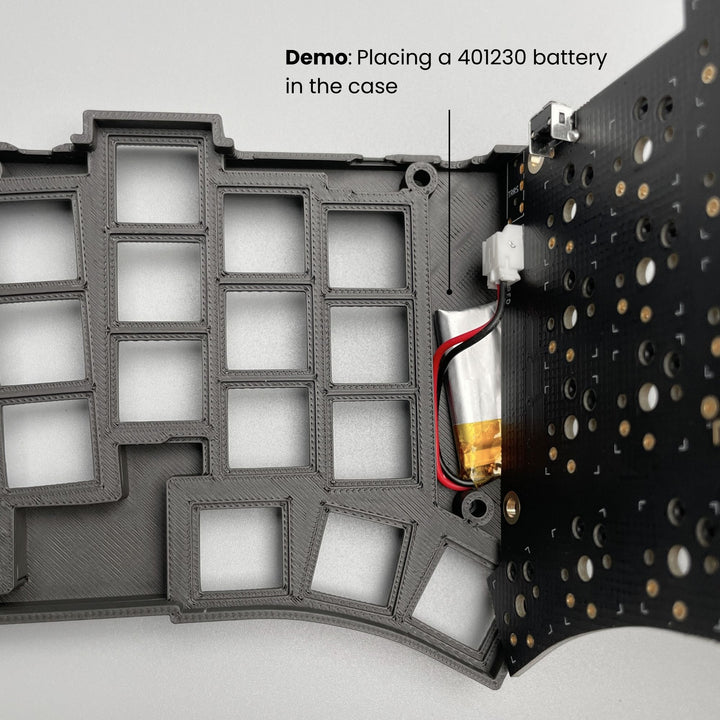 - It’s a modified version of TOTEM keyboard & case. JST battery sockets are added to the board. Therefore, it is not compatible with the original TOTEM case.
