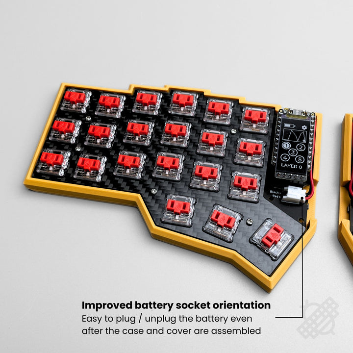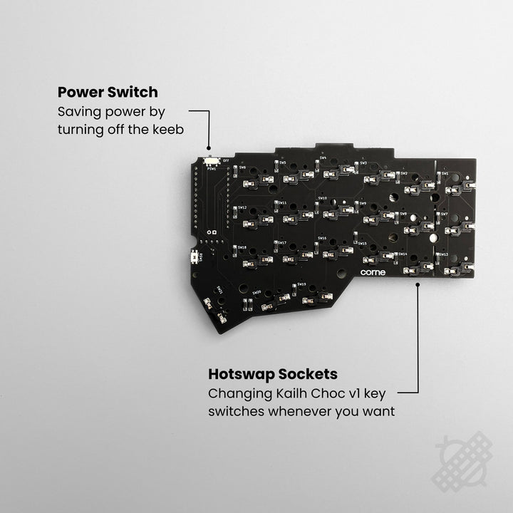 - Improved Battery Management: Power switches and JST battery sockets have been added to the Corne keeb. These additions make it easier to control power supply and facilitate seamless battery replacement.