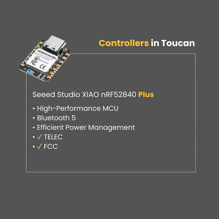 - Wireless - Powered by the latest Seeed Studio XIAO nRF52840 Plus controller, the Toucan connects to iPads, notebooks, and computers via Bluetooth. It can also pair with a Bluetooth dongle, such as the Prospector.