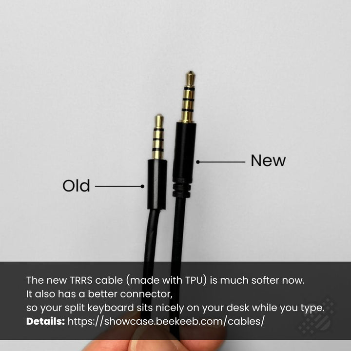 The new TRRS cable is much softer now because it is made with TPU. It also has a better connector, so your split keyboard sits nicely on your desk while you type.