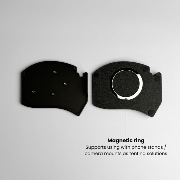 It is integrated a magnetic ring to the bottom case that supports using with phone stands, camera mounts as tenting solutions